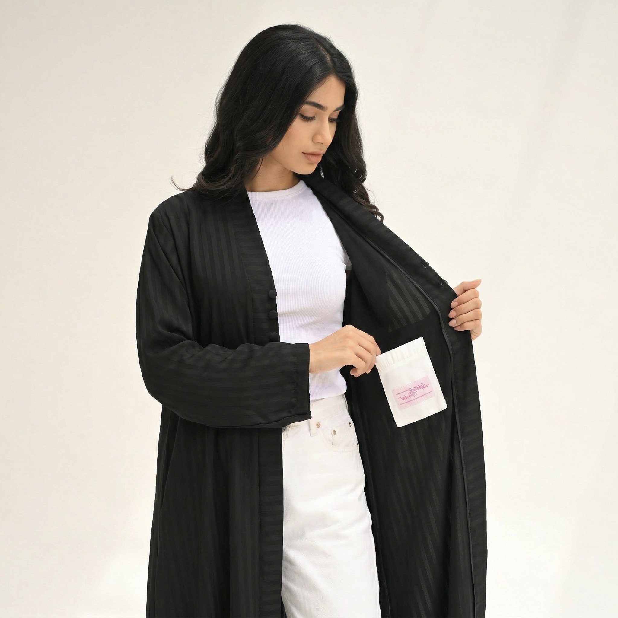 An abaya with nostalgic early 2000s–inspired pockets, designed to hold your lip gloss.